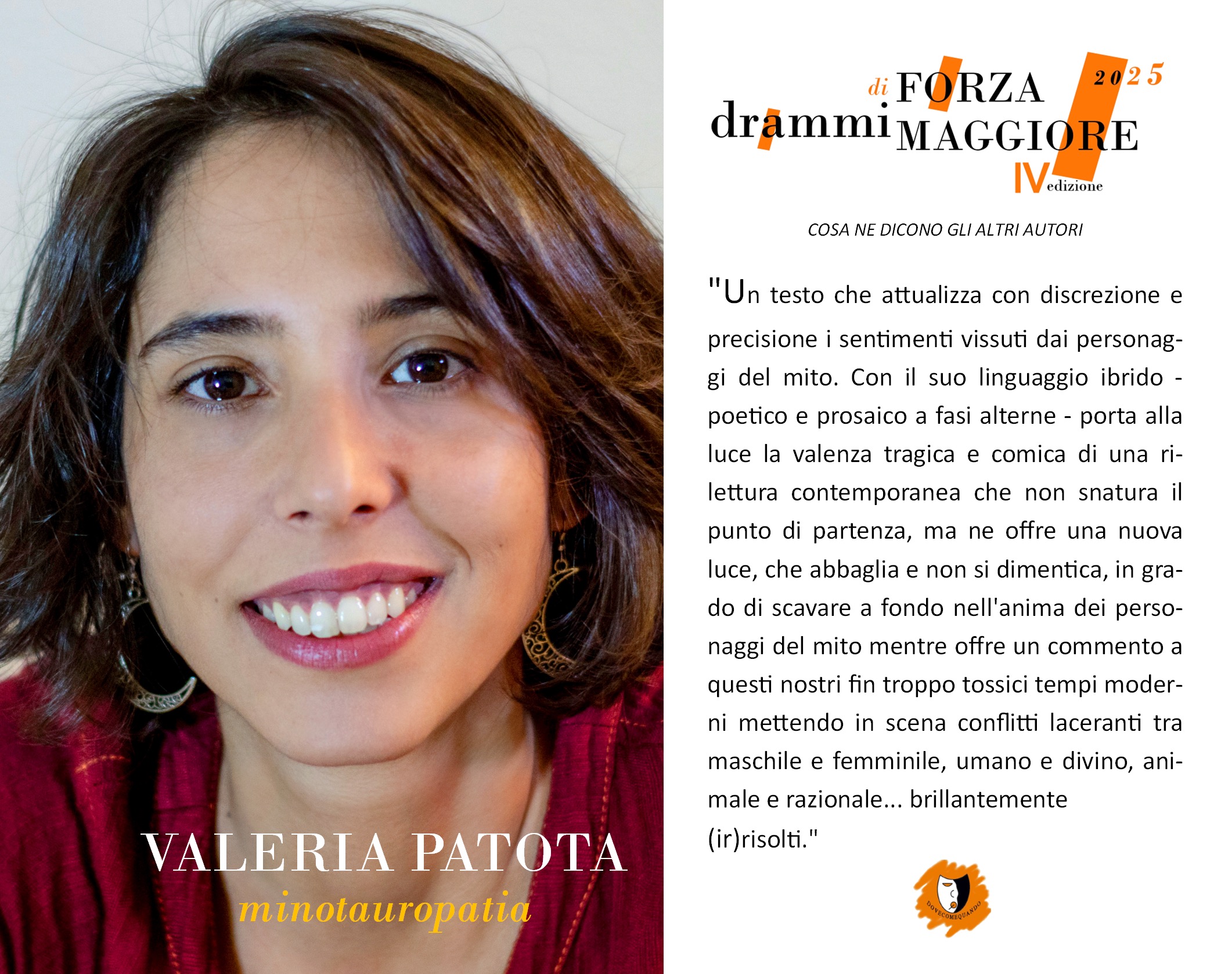 DoveComeQuando organizza e promuove in collaborazione con ScriptDoctor & PlayDoctor il premio di drammaturgia Drammi di Forza Maggiore dal 2021 per sperimentare nuove forme di apertura, incontro, contatto e confronto, che mai come in questo caso si sono basate sulla partecipazione massiccia, dall'inizio alla fine, della comunità di autori.